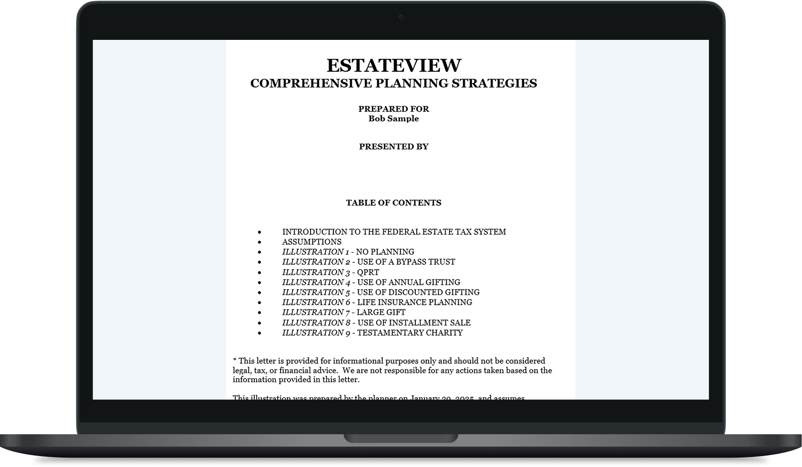 We invite you to take a first-time free trial and join a complimentary workshop to see how EstateView makes planning easier, more effective, and more impactful for your clients.